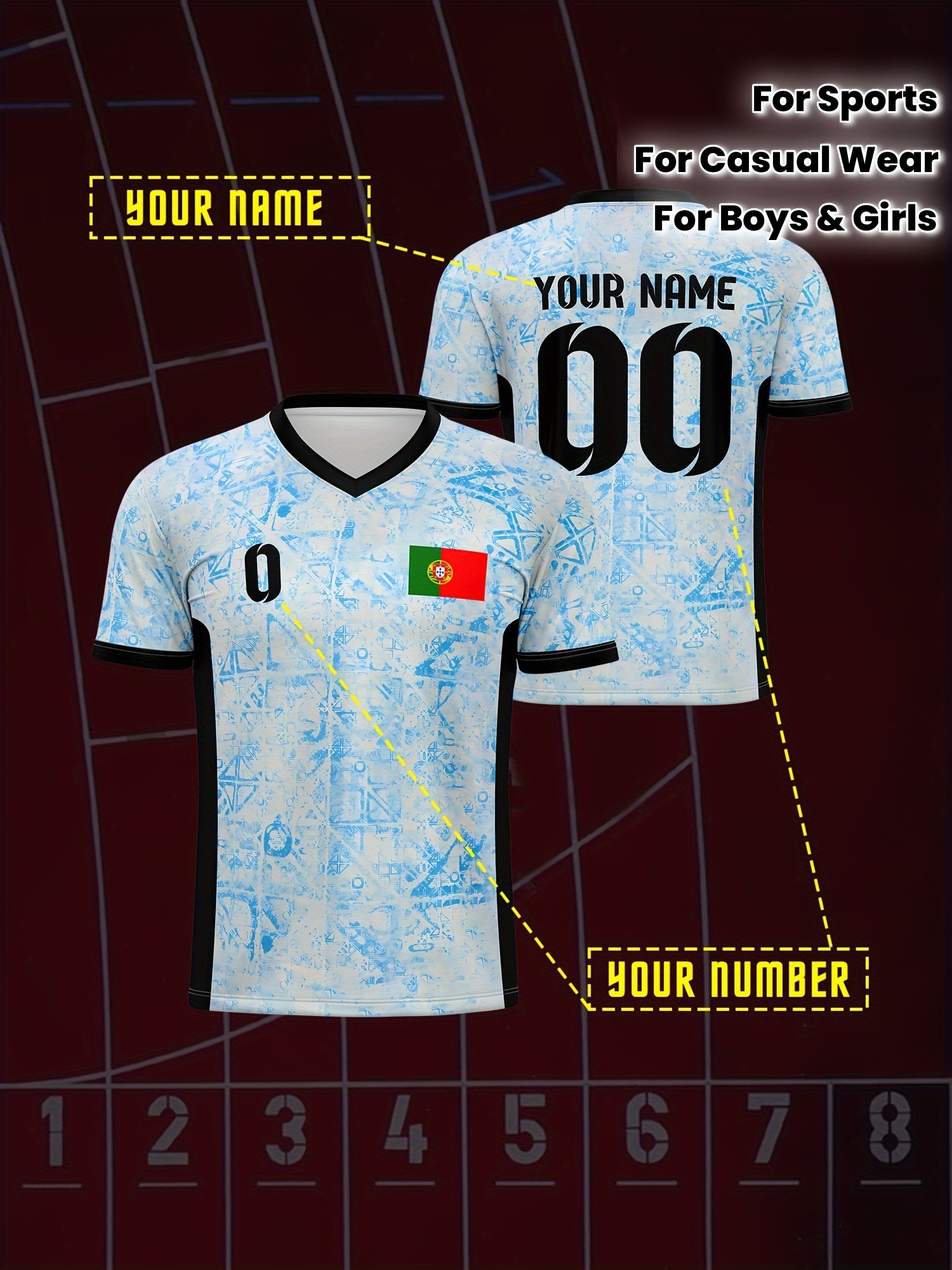 Customizable Youth Soccer Jersey - V-Neck Athletic Top with Name & Number, Light Blue & White Pattern, Breathable Fabric for Soccer, Running, Beach & Casual Wear, Soccer Accessories, Soccer Player Gear, Sporty Youth Design, Comfortable Fit